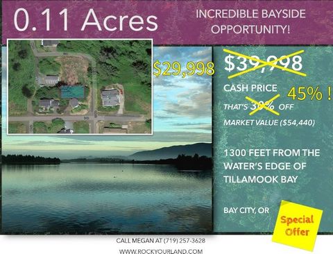 PRICE DROP!!! NOW $29,998 – THATS 45% OFF MARKET VALUE!!! Sale Price: $29,998 (45% BELOW MARKET!) “Serene and Quiet Living with Hilltop Ocean Views!” Call or text: (719) 257-3628 or visit http://www.rockyourland.com What an opportunity! This beautiful Bay City Parcel on top of the hill with amazing ocean views!! Build a beach bungalow, a vacation rental by owner investment, a weekend getaway, or a dream come true to live by the ocean. The property is sloped (like many of those around it) but the views are second to none! Public utilities are all available to the property, so you only need to plan for the home! The possibilities are limited only by your imagination for what you could do with this lot! Homes nearby offer many ideas and inspiration. A raised deck would have stunning views of the Bay and beyond. From the top of the hill, unobstructed views of the water and there no development behind the hill… this is a quiet retreat away from the main roads, and a serene getaway to enjoy for decades to come. The market value on this property is over $54,000 – the market is HOT! You can own this property today for only $39, 998 – WHAT A DEAL!!! We’ve sold many Tillamook county properties and we know this one won’t last long, so don’t wait – call or text today at 719-257-3628. Own today for 45% below Market, only $39,998. No Realtors, No Commissions. DON’T WAIT! This property will go fast! Visit http://www.rockyourland.com or call/text: (719) 257-3628