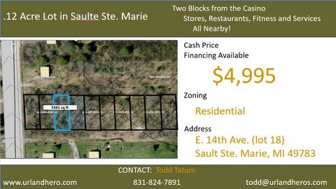 .12 Acre Lot in Saulte Ste. Marie two blocks from the casino, restaurant shopping and more! WHY BUY?: #1. The lot is conveniently located in Sault Saint Marie and walking distance to entertainment, exercise, shopping and dining. #2. You can park your RV on the lot and explore the area of foot OR short drives to all that Sault Ste Marie offers! #3. Multiple Purchase Options Available! Including seller financing OR purchase this massive lot today for only $2,995 cash! COMMUNITY DETAILS: This parcel is perfectly located in Sault Ste Marie, MI and is an excellent location to park your RV and eliminate hotel bills! OR, add a mobile home or vacation home. Walking distance to entertainment, exercise, shopping and dining. Many indoor and outdoor activities to explore in Sault Sainte Marie. Price is set for a quick sale. Don’t miss out on this steal of a deal! USAGE DETAILS: – Residential Uses: Camper parking, Mobile Home, Single-Family PROPERTY DETAILS: – Lot Type – Land – Sale Price – $4,995 – State – Michigan – County – Chippewa – Assessor’s Parcel Number – 051-824-018-00 – Property Usage – Residential Uses – Property Address – 14th Ave. Sault Ste. Marie, MI 49783 – Size – 4960 sq ft (80’ x 124’)- Access – Gravel Road – Water & Electricity – At the Street – Septic – Private ACCESS DETAILS: – Lot GPS Coordinates: 46°28’45.2″N 84°19’16.0”W – Across the street from 1820 14th Ave (Residence). 80’ from the Shunk Rd. and 14th Ave intersection POPULAR ATTRACTIONS: – Kewadin Casinos – 2 blocks away – Gambling, Concerts, Dining, – Sault Ste. Marie Country Club: 1 mile away – Golfing, Casual & Fine Dining, Swimming Pool, Shopping – Big Bear Arena, .6 miles away – Ice Skating, Fitness Club, Nature Trail, Sporting Events (Local Hockey) – Sault Ste Marie Attractions, varies – Points of interest, landmarks, museums, aquarium and more PURCHASE OPTIONS: Drop everything and buy this immense property today for only $2,995 cash! OR own this by putting $800 down with low monthly payments. GOT QUESTIONS? WE HAVE ANSWERS!: – Call/Txt/Email Todd Tatum @ 831-824-7891, todd@urlandheros.com. – We may have other properties at bargain prices available. All you have to do is ask! – Don’t hesitate! Connect with us today while this deal is still Available!