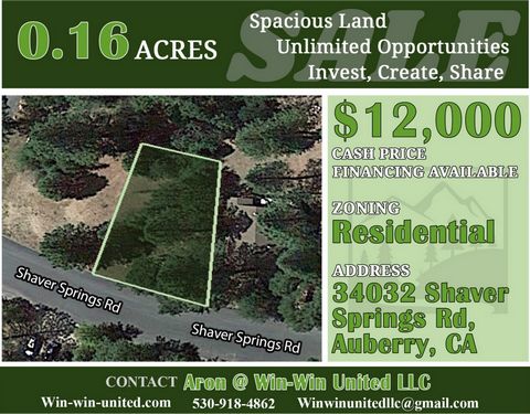 0.16ac Nestled in a Wonderful Community & Selling 33% Below Value ~~ Contact Aron @ Win-Win United LLC to learn more: 530-918-4862 – winwinunitedllc@gmail.com ~~ WHY BUY?: #1. Get out of the heat and enjoy some fresh air just minutes from Shaver Lake. #2. This little piece of paradise is a must see!! #3. Multiple Purchase Options Available! Take advantage of this low price and buy today for only $12,000 cash or finance $18,000, with flexible terms! COMMUNITY DETAILS: You will enjoy this nice neighborhood which offers easy commutes to Clovis or Fresno (about 1 hour), Visalia (1.5 hours) and Modesto (about 2 hours). And this land is also minutes away from the snow, as it’s situated near the mountains, which offer beautiful views everywhere you look! Additionally the location provides an effortless walk to the Shaver Springs community pond. Overall this is a great area for families to raise kids or to retire. Do not miss the opportunity to turn this amazing land into a perfect getaway/retreat or starter home! USAGE DETAILS: – Single Family Home – RV storage/parking PROPERTY DETAILS: – Lot Type – Land – Sale Price – $12,000 – State – California – County – Fresno – Assessor’s Parcel Number – 130-351-13 – Property Usage – Single Family Home – Property Address – 34032 Shaver Springs Rd, Auberry, CA 93602 – Association Community – Shaver Springs – Size – 0.16 Acre(s) – Road Access – Yes, Paved – Electricity – At the Street – Water & Sewer – Public / County connections – Market Value – Similar lots in the area are listed for $14,900 & have sold for $20,000! ACCESS DETAILS: – Shaver Springs Rd is a paved road. – Lot Address: 34032 Shaver Springs Rd, Auberry, CA 93602 – 34048 Shaver Springs Rd is the address to the neighbors house, which is adjacent to the lot POPULAR ATTRACTIONS: – Sierra National Forest, 13 minutes away – This is the perfect vacation spot with amazing lakes and beautiful pines / wilderness areas. – Shaver Lake, 24 minutes away – The lake is a nice spot to go camping, boating and fishing. – Tamarack Sno-Park, 35 minutes away – Such an awesome Park for sledding and tubing for kids and family. – Wild Water Adventure Park, 45 minutes away – This is a great place for the whole family with tons of water attractions. – Sierra Bicentennial Park, 47 minutes away – What a fantastic, well maintained park that has several picnic areas, baseball, soccer and cricket fields, a playground, rock climbing area for young kids, batting cages, a small dog park, numerous walkable concrete paths and so much more! PURCHASE OPTIONS: This land has it ALL & more! Finance $18,000 or buy with $12,000 cash! GOT QUESTIONS? WE HAVE ANSWERS!: – Call/Txt/Email Aron @ Win-Win United LLC @ 530-918-4862, winwinunitedllc@gmail.com – We may have other properties at bargain prices available. All you have to do is ask! – Don’t hesitate! Connect with us today while this deal is still Available! DISCLAIMER: Buyer must verify & work with County to know what can & can’t be done with the land, obtain proper permits if needed & confirm the availability of any utilities needed/serviced on the lots. Seller makes no warranties or representations about the land, its condition, or what can be built on the parcel.