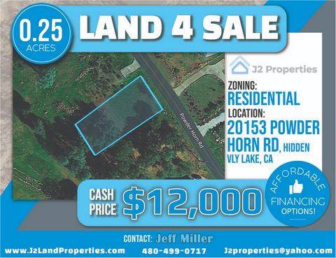 0.25ac in Hidden Valley Lake Dollar SPECIAL Selling an Incredible Deal! Don’t miss out on it **************************** Contact Jeff Miller to learn more: 480-499-0717 – j2properties@yahoo.com **************************** So you say you want Privacy, Security, Stunning Views & an abundance of activities so each day is an adventure? Look no further! This land has it ALL & more! This lot is located in the Secure, Gated Hidden Valley Lake community, which boasts of 102 surface acres of Lake that have 2 manicured beaches & large dive rafts at the larger beach, play areas that have BBQ pits, Picnic Tables, Volleyball & Tennis courts, a clubhouse with an Olympic size swimming pool, an Equestrian center, Hiking Trails, Campgrounds, a 18-hole Golf Course & so many more amenities! The neighborhood is filled with Gorgeous Single Family homes, which are used as full time & GetAway residencies. Are you ready to build your Dream Home in a community that’s centered around making everyday a Vacation? Thanks to Clear Lake & nearby Museums & Historical centers, like the Stone House, there’s an abundance of activities less than 20 minutes away. This deal won’t be available for long! Contact us now to learn about our flexible payment options. **************************** Visit the parcel by driving down the paved Powder Horn road. Put the following address in Google Maps, it will take you right to the property: 20153 Powder Horn Rd. The residential zoning allows you to build your Forever Home or a Getaway House packed with fun activities for you & your family to enjoy. New builds must minimally have 1,250 sq ft of living area. Electricity & Water are accessible at the street. Energy generation via Solar power is also allowed. Buyer will have to set up a private septic system. To learn more about the Hidden Valley Lake Association, visit hvla.com. **************************** Buyer must verify & work with County to know what can & can’t be done with the land, obtain proper permits if needed & confirm the availability of any utilities needed/serviced on the lots. Seller makes no warranties or representations about the land, its condition, or what can be built on the parcel. **************************** For just $5,900 cash, you could be the owner of this great property! OR finance $8,900, contact for more details. **************************** Drive 20 minutes, to Lower Lake to Enjoy some Adult Fun at the Twin Pine Casino & the Vigilance Vineyards & Winery. Start the day testing your Luck & end the day celebrating your wins with bottles of Delicious Chardonnay! Plus in less than 40 minutes you can Easily Escape to Nature & find Tranquility at Old Faithful or the Petrified Forest. Don’t forget, Lovely Green Spaces are also in your backyard! And this land is only 37 minutes from Calistoga, 1 hour to Santa Rosa & 85 minutes to Napa. **************************** Purchasing property from us is quick & effortless. This property will be closed by a local title company & is guaranteed to be free of all liens and encumbrances. Buyer will receive title insurance & warranty deed. Message us here/call us today to get started. **************************** We are currently offering this discounted lot to be financed at $8,900, contact for more details / $5,900 cash. **************************** Property Details: Lot Type – Land Sale Price – $5,900 State – California County – Lake Terrain: Slight Downward Slope Elevation: 1099.1ft Assessor’s Parcel Number – 141-521-06 Property Usage: Single Family Dwelling Property Address – 20153 Powder Horn Rd, Hidden Valley Lake, CA 95467 HOA Community & Contact: Hidden Valley Lake, hvla.com Size – 0.25 Acre(s) Road Access – Yes, Paved Electricity – At the Street / Solar Water – City Septic – Private **************************** To buy this lot at this discounted price call/txt/email Jeff Miller @ 480-499-0717, j2properties@yahoo.com. Note: Other properties at bargain prices are available! Don’t miss out on these great deals call/text us now!