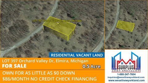OWN THIS TODAY FOR JUST $1,800.00$999.00 FULL CASH PRICEor$1,399.00 With Seller FinancingSAVE $401.00 / 22.3% OFF MARKET VALUE All Deposits Are Fully Refundable Within 48 hours Check Out Our Buyer Protection GuaranteeCheck Out Our Affordable Payment OptionsSECURE WITH DEPOSIT TODAY This Wholesale Land For Sale in Elmira, MI Is All About Seclusion in a Highly Sought After Residential Recreational Community: Lot 397 Orchard Valley Dr. Elmira, MI 49730 Land for Sale. This vacant land is a 0.50-acre vacant land lot that’s a short drive to the Exclusive Member-Only Golf Course within a private and tranquil location with easy access to Mancelona 16 miles away, 11 miles northwest of Gaylord, in the heart of northern Michigan with amenities like Lowes, Home Depot, Walmart, and the Canadian border is about 105 miles away. A Quality Addition to Your Portfolio: As a Lot 397 Orchard Valley Dr. Elmira, MI property owner you get an enormous amount of perks and benefits of being apart of the Lakes of the North Association which includes access to the Lakes of the North Golf Course an 18-hole course is a par 72 that spans 7,000 yards. As a Lot 397 Orchard Valley Dr. Elmira, Mi property owner you also get Private Member Amenity access to Harold Lake and Pencil Lake with Beach houses with Canoe, Rowboat Use, and more. Lakes of the North Clubhouse with an indoor pool, tennis courts, lounge area, and more. Settings Restaurant that’s open year-round casual setting, daily specials, and Free WiFi access. Lake Arrowhead Campground with 160 campsites, fire pits, 2 bathhouses, storage facilities, and more. Plus, Winter Sports Area with a skating rink, snowmobile trails, skiing trails, and more.Lakes of the North Airport with a 4,350′ asphalt runway that’s Open Year AroundHorse stables with seasonal guided horse rides, great for family Create A Striking New Family Home: Lot 397 Orchard Valley Dr.. Elmira, MI is an ideal investment with tons of potential in this area for those who love to stay away from the hostility of the city. Nestled close to lakes and year-round recreational attractions, you’ll have plenty of things to enjoy here. Secure Your Elmira, Michigan Address Today: Lot 397 Orchard Valley Dr. Elmira, MI is uniquely located near single-family homes in a peaceful and serene neighborhood just waiting for your custom-built home of immense charm and casual elegance to complete this neighborhood. DRIVE-BY ANYTIME… Take A Tour, You Won’t Be Disappointed. Antrim County, MI Profile What’s Happening in Antrim County MI? Antrim County is one of 83 counties in the State of Michigan that is located in the Bellaire, MI. Area Information: Antrim County is located in the northwestern part of the lower peninsula, east of Lake Michigan and Grand 5 miles of waterways throughout the area. Traverse Bay, and bordered on the west by the Mackinaw State Forest also referred to as the Jordan River Valley. The county has a total area of 602 square miles of which 477 square miles of it is land and 125 square miles of it is water. The county contains 45 lakes, has 24 miles of Lake Michigan shoreline, and rivers covering 65 miles of waterways throughout the area. Antrim County has nearly 44,000 acres of state forest land, the Grass River Natural Area and Wilcox-Palmer-Shah Nature Preserve. Most notable of the lakes is Torch Lake, considered to be one of the most beautiful lakes in the world. Torch Lake is on a chain of lakes that runs from Bellaire to Elk Rapids. North of Bellaire is another chain of lakes that goes from there through Central Lake and Ellsworth, with the largest of these being Intermediate Lake. Mancelona, located in the southwest corner of the county, on US-131, is home to the annual White Pine Stampede, Bass Festival, and Deadman’s Hill Scenic Overlook. Antrim county also has over a dozen fine golf courses and is a major ski resort area, home to Shanty Creek Resort. The county is the 8th smallest in the state and holds its county seat in Bellaire. Major Cities and Towns: Antrim County consists of 4 towns Alba, Alden, Eastport, and Kewadin, 6 villages including Central Lake, Bellaire, Central Lake, Elk Rapids, Ellsworth, and Mancelona. Elmira, MI Neighborhoods Hawks Eye Resort, Hawks Eye, Hawks Spur, Valdenspiel, Valley View, Adams Beach, Maple Valley Estates, Maplewood Estates, North Schuss Village, Obervalden, and Old Mission Shores Elmira, MI Cost of Living The cost of living in Elmira, MI is -1.8% lower than the National Average. What’s Happening in Elmira, MI? Elmira Township is a civil township of Otsego County in the U.S. state of Michigan. Elmira, MI Comparable Land This is the cheapest lot you can find in this area is listed: Click Here To More Expensive Listing Property Details Address: Lot 397 Orchard Valley Dr. Elmira, MI 49730 Frontage: 95 ft. (Estimated) GPS Coordinates: 44.9669, -84.8521 Status: Active State: Michigan County: Antrim County Closest Community/City To The Property: Gaylord, MI APN (Assessor’s Parcel Number): 05-13-450-397-00 Lot Size: 0.50 Acre Property Type: Residential Vacant Land Zoning: Residential, Platted Terrain: Level Road Access: Paved Utilities: Electricity Water Supply: Well Required Sewer: Septic Required Annual Taxes:$41.47 (Estimated) HOA Dues: $428/Year (Dues are reduced to $166 USD per year for each additional lot after the first lot) Disclosure: The owner has not visited the property and is not aware of the overall condition and may require permits, surveys, or zoning changes. This is a free & clear parcel with no liens and taxes are paid to date. We cannot provide suggestions, or advice with regards to your purchase and buyers should do due diligence on property condition, permits (if applicable), surveys, or zoning before purchasing. This property has been discounted from being sold “AS IS” without any warranties or representations of any kind or character, express or implied, concerning the property. If you need assistance determining a fai