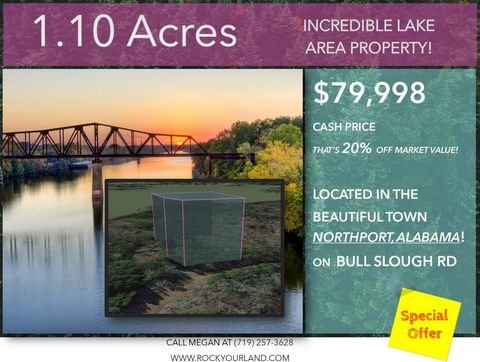 “Serene and Quiet Living Close to So Much Fun!” Call or text: (719) 257-3628 or visit http://www.rockyourland.com This beautiful 1.10 Acre lot is in NORTHPORT, AL. A small and quite community close to all kinds of tourist destinations, recreational activities, and more! Close to Tuscaloosa (16 mi) and Birmingham (73 mi) you’re never more than a 20 min drive to all of the conveniences of city life, but with a feeling of privacy and serenity. If you’ve ever thought of owning property to build your dream home, this is your chance to own a beautiful parcel in an area that is perfect for couples, families, and retirees alike! All the comforts of modern living are within driving distance, surrounded by privacy and beautiful scenery to put you in the perfect place to make your dreams a reality. A destination for you and your family to explore and grow closer together while enjoying everything the outdoors has to offer. Whether you enjoy camping, boating, fishing or just the realization you’ve acquired land in the path of growth, ultimately, one day you will be rewarded for your vision. There is no zoning restrictions on this property making it the perfect location for whatever it is you’re looking to do! Build a beautiful lake home, park your RV and stay a while, or use as a family getaway cabin. You’re only limited by what you can dream to do! Don’t wait, this incredible property WILL go fast – call now! For more information visit http://www.rockyourland.com or call/text: (719) 257-3628 Own today for 20% below Market, only $79,998. No Realtors, No Commissions. Property Details: Location: Bull Slough Rd, Northport, AL 35475 Zoning: None Terrain: Treed, some sloping Road Access: yes Market Value: $100,000 DON’T WAIT! This property will go fast! Visit http://www.rockyourland.com or call/text: (719) 257-3628