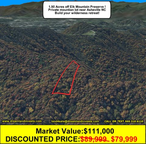 Secluded mountain top lop adjacent to Elk Mountain Scenic Highway. Perfect location to build your retreat, situated at 3,300 feet and overlooking Elk Mountain Preserve and the Parkway in the distance. Watch the sunrise and the sun setting shadows on the slopes and the long-range views and seasonal changes. Convenient access to Asheville, shopping, entertainment, and dining along unbelievable Elk Mountain Scenic Hwy or the Parkway. Extravagant homes surround this area for building and holding value, yet this land not hampered by restrictions or HOA. This lot is part of a subdivision that was not completed, utilities have not been laid. Rumors being circulated that some of the lower properties are going to be started on some time soon, so get this while you can for this price! Payment options: Cash Price $79,999 Market Value $111,000 Seller Finance $85,000 Flexible owner financing Call Text or Email To Inquire: 888-318-6110 or land4sale @dreamlandinvest.com and Quote Reference ID: BUNC-NC68586Property DetailsAPN/Parcel No.: 975197328700000Acres: 1.9Square Feet: 82,764County: BuncombeRoad access: Yes, unpaved but graded and easily driveablePower: Not Connected Grigg Electric Co Inc +18282320021Water: Well requiredSeptic: Perc test passed, needs septic GPS Coordinates: 35.670285, -82.504288Zoning Code: Open Use DistrictLand Use: -Single-family residential dwelling, including modular-Two residential dwelling units (attached or detached)-Multifamily residential dwelling units (no more than eight units in no more than four buildings)-HUD-labeled manufactured homes-Manufactured home parks (8 units or fewer)-Manufactured home parks (more than 8 units)-Accessory buildingsElevation 3337 feetDimensions – approx: 378.5 ft x 223.5 ft x 608.5 ft x 190.4 ftMobile Home allowed: YesCamping allowed: YesRV’s allowed: YesTravel trailers and/or recreational vehicles may be used as a temporary single-family dwelling for no more than 180 days out of the calendar year only in those districts that permit travel trailers or travel trailer parks. In no case shall a travel trailer or recreational vehicle be permanently set up or affixed to the ground or site, nor shall it be used as a permanent single-family dwelling. When utilized as a temporary single-family dwelling, a travel trailer may not be located within a single travel trailer park for more than 180 days out of the calendar year. If a travel trailer is disconnected from all utilities, is tagged and road-ready, and is not utilized as a temporary dwelling unit on-site, it will be considered a parked vehicle for the purposes of this ordinance.Terrain: SlopeAnnual Taxes: $439.31 for 20 (current year)Tax Jurisdiction: CountyHOA Association: NoneHOA Fees: None Property Description Call Text or Email To Inquire: 888-318-6110 or land4sale @dreamlandinvest.com and Quote Reference ID: BUNC-NC68586 Secluded mountain top lop adjacent Elk Mountain Scenic Highway. Perfect location to build your retreat, situated 3,300 feet and overlooking Elk Mountain Preserve and the Parkway in the distance. Watch the sunrise and the sun setting shadows on the slopes and the long-range views and seasonal changes. Convenient access to Asheville, shopping, entertainment, and dining along unbelievable Elk Mountain Scenic Hwy or the Parkway. Extravagant homes surround this area for building and holding value, yet this land not hampered by restrictions or HOA. This lot is part of a subdivision that was not completed, utilities have not been laid. Rumors being circulated that some of the lower properties are going to be started on some time soon, so get this while you can for this price! DISCOUNTED FOR CASH! $79,999 and it’s ready to own today! We seller finance! Ask us today how we can agree on a plan that’s just right! 888-318-6110 – Once we close, the land is ready to use and enjoy while payments are made. – No cancellation or prepayment penalties! Property InformationReference ID: BUNC-NC68586State: NCCity: AshevilleNearest Cities: Asheville, NC (downtown ~8 miles away)Parcel #: Lot 2Address: Off ELK MOUNTAIN SCENIC HWY (Closest address with a home is: 798 ELK MOUNTAIN SCENIC HWY, ASHEVILLE, NC, 28804)Legal Description: Subdiv: SCOTT CONSTABLE Block: Lot: 2 Section: Plat: 0106-0046Purchase Information/Fees $1,000 Earnest Money The Minimum Earnest Money Down of $1000.00 is to reserve the property and is required to begin the purchase process. This is a non-refundable fee and takes the property off the market. $1,000 Closing Costs An approximate additional cost of $1000 to close on this property with the escrow attorney (preferred and allows you to purchase title insurance) – tax, title, deed, etc. Nearby AttractionsGrovewood Village – 21 min (7.3 miles)Main Street Nature Park Weaverville – 22 min (10.6 miles)Chicken Alley Mural – 23 min (8.6 miles)Statue: Childhood – 25 min (8.9 miles)Bitmore – 11 MilesCraggy Flats Tunnel – 23 min (12.4 miles)LaZoom Tours – 26 min (9.0 miles)Botanical Gardens at Asheville – 22 min (8.1 miles)Asheville Pinball Museum – 25 min (9.1 miles)Beaver Lake Bird Sanctuary – 17 min (6.4 miles)Craggy Pinnacle Tunnel – 25 min (13.6 miles) Also close by you’ll have access to all you need with (shopping malls, markets, major retail chains) all within an easy distance. Call Text or Email To Inquire: 888-318-6110 or land4sale@dreamlandinvest.com and Quote Reference ID: BUNC-NC68586Area Information Downtown Asheville, restaurants and shopping 11 MilesBuzzard Rock – view of valley JUST MINUTES AWAY!Property is adjacent to Elk Mountain PreserveMap GPS Coordinates from Google map for exact property: 35.670285, -82.504288 Directions Google Link: https://goo.gl/maps/xWSxH2wxg4E4yTWx7 Disclaimer The buyer is responsible for verifying all information with the County as to what can and can’t be done with the property. The buyer will need to work with the County to obtain the proper permits if needed. The buyer will also need to confirm the 