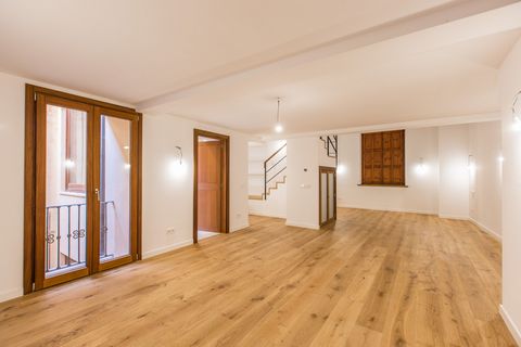 Spacious newly built apartment located in an old palace renovated as a residential building, located in the old town of Palma, with its impressive courtyards and stately homes in a Mediterranean setting. It is located a few meters from the Parc de la Mar and the Cathedral. The development consists of 10 exclusive homes in which the artistic historical elements have been preserved combined with a modern design. This sought after historic area of Palma ensures a stable investment. The high demand for rentals and low community fees are great advantages for the owners of apartments in the old town. The apartment is distributed over 2 floors, the house is accessed through the beautiful central courtyard of the building. On the lower floor when entering we find the dining room and kitchen. At the back is the master bedroom with an en-suite bathroom. In the background we have the living room with a fireplace and a window to an interior patio. On the upper floor there are 2 bedrooms with bathrooms en suite.