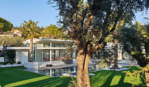 Close to the old village and 10 minutes drive to Cannes and the beaches, quiet, south facing, outstanding single-storey contempory style villa designed by an acclaimed french architect and recently extended. The flat landscaped garden of roughly 3000 sq.m notably planted with numerous and ancient olive trees enjoys a splendid 17m long pool. The villa also includes an awesome indoor pool, a fitness area with hammam and a cinema room.