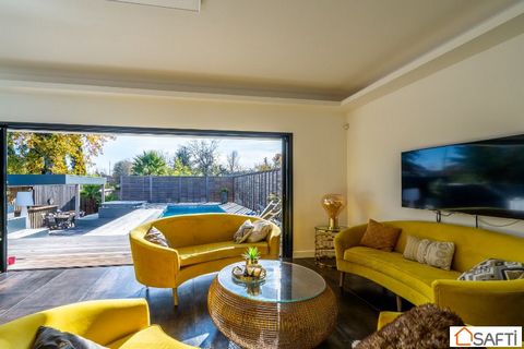 Nestled on a landscaped plot of 700m², with a swimming pool, a jacuzzi, a summer kitchen and a bowling alley, its 220m² of living space spread over three floors are as follows: