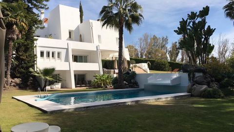 Spacious contemporary villa built in early nineties faces south east and offers spectacular views to Sierra Blanca Mountain and Los Naranjos golf course. Villa is built on three levels. Easy access to all floors by an elevator or staircase. Panoramic views from the roof terrace. Main floor: Entrance hall, spacious living and dining room with open fireplace. Direct access to a large covered terrace and garden. One bedroom suite. Cloak room. Recently renovated modern kitchen, laundry room and a separate bedroom with bathroom for maid. Plenty of storage space. First floor: Master bedroom suite with fireplace and terrace with excellent views. Two more bedrooms with bathrooms; one facing east and the other one towards west. Both of these bedrooms have their private terraces. Ground floor: Huge family room; now used as a bedroom suite. Direct access to the swimming pool. One smaller room which can be used as a bedroom or an office. Indoor swimming pool with sauna & gym. Landscaped garden with partially heated swimming pool. Garage for two cars and plenty of outside parking space. A very special property in excellent location.Villa in Nueva Andalucia for holiday lets