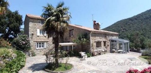 This 17th century Catalan Mas is in a mountain location in the Vallespir, Languedoc-Roussillon, Occitanie region of the South of France. The property gives a real sense of privacy and isolation and is wonderful for nature lovers, but is only a few kilometres of easy road from the nearest town. The land around the mas is open and sunny, surrounded by prairie, forest and mountains with a pool, tennis court, and trout pond. More than 3kms of track allow you to circulate around your land, winding up the mountainside to an old stone sheepfold of c 60m² and further prairies. This land is a paradise, served by several springs, ideal for horses or other animals. The main house is divided currently into two apartments, one on each floor and a large stone outbuilding houses the garage, workshop and further accommodation, currently an en-suite bedroom, but potentially a small studio. The house could be left as two apartments to provide gîte income, or remodelled into a large family home or B&B.Description of the Building