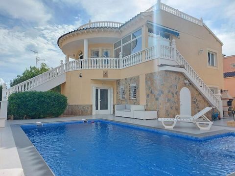 Detached Villa Pinar de Campoverde. Fantastic corner Villa in Pinar de Campoverde with wonderful sea views. This property has 5 bedrooms and 3 bathrooms on two floors, air conditioning with heating throughout the house, alarm, as well as a private pool and large garden. On the first floor of the house we find a spacious living room with lots of light with access to all rooms. To the right we have a fully furnished kitchen with appliances, as well as a water filter and a cozy glazed porch. On this first floor there are two of the bedrooms with built-in wardrobes and a spacious bathroom. From the living room there is an internal staircase to go down to the ground floor of the house that consists of a second living room with a gas fireplace, three bedrooms (one of them with an en-suite bathroom) and two bathrooms. The garden has a pool of approximately 8x4m with a Jacuzzi as well as a barbecue and a large pergola to enjoy with friends and family. This property is located only a 5 minutes walk away from the local restaurant area and supermarkets.