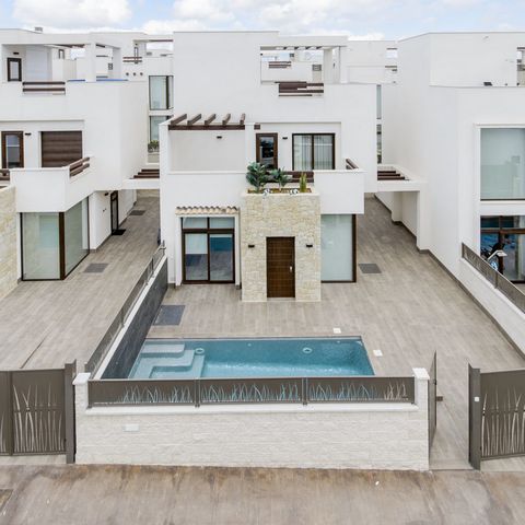 Brand New, Key Ready, three bedroom,three bathroom villa in Ciudad Quesada, Alicante. A modern, newly built villa situated in a beautiful and quiet area between Ciudad Quesada and Pueblo Bravo; adjacent to the Natural Park of Las Lagunas de La Mata and Torrevieja, and close to the beaches of Guardamar. The villas are of a contemporary, stylish design with many large windows which illuminate the property. The kitchen, living and dining area is a sleek, open-plan layout, featuring modern appliances and plenty of space for entertaining and hosting guests. There is a stunning sweeping staircase leading to the first floor of the villa, which leads up to the three spacious double bedrooms and bathrooms. There is a basement, outdoor terrace, private garden and private 6,5×3,3 metre swimming pool. An excellent, modern villa in a great location.