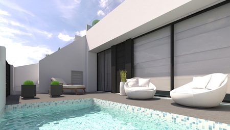 A small select development of just 8 semi-detached villas located in the very popular coastal town of Pilar de la Horadada, Alicante. Offering three bedrooms, two bathrooms (one is en-suite), living/dining room, open plan kitchen with all appliances included, external access to the large rooftop solarium (89sqm), private (tiled) garden, storage space, off road parking. All three bedrooms have access to the private rear patio area. The properties also come with option for a private swimming pool (6×3) as well. Perfectly designed with an open airy feel to the home – located next to a park area and a short walk to the town centre. The town is close to a coastline of fine sand and clear water beaches, interspersed by attractive inlets, all offering a full range of services. The beach at Mil Palmeras is ideal for sailing enthusiasts, linking up with the Rincón and Puerto inlets! The latter with a promenade that comes alive on hot summer nights. Las Villas, the beach behind Torre de la Horadada Marina, is the longest beach followed by a smaller beach at El Mojón, which reaches the border with Murcia province. Close to the popular golf course of Lo Romero Only 15 minutes to San Javier Airport and 45 minutes to Alicante Airport. Prices starting from 189.950€, bigger plots available (180sqm) = 209.950€