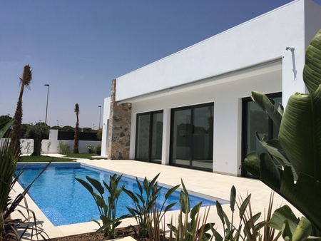 Brand new luxury villas in Santiago de la Ribera, Murcia(Costa Calida). The property boasts a spacious living/dining area, fully fitted kitchen (Bosch appliances), three bedrooms with fitted wardrobes and electric shutters, two fully fitted bathrooms with under floor heating, private swimming pool with blue ceramic tiles and white led lighting, air conditioning throughout the property, storage room and off road parking. Santiago de la Ribera is on the Mar Menor, on the coast of Murcia. This old fishing village has 4 kilometres of beach, with fine, golden sand. Its Mediterranean waters are ideal for enjoying the sun, sea and water sports all year round. It has an attractive, palm-lined promenade that runs the length of the beach.