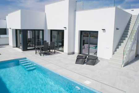 Brand new, modern 3 bedroom villas with private swimming pool located in Lo Pepin, Ciudad Quesada. These brand new villas are built on plots of between 310 and 440 square metres. The villas themselves have floor space of 124 square metres, with three bedrooms, two bathrooms, open living room, dining room and modern kitchen with all electrical appliances. A spacious sunny terrace measuring 45 square metres has been built on top of the villa, so that you can enjoy the sun and get the full impact of the stunning views. The property also boasts air conditioning throughout, under-floor heating in both bathrooms and your own private 7 x 3 swimming pool. The villas are designed for optimum enjoyment of the gorgeous views and fabulous surroundings. The living room, kitchen and terrace on the south side of the property. The views are not hampered by neighbouring villas because the site is terraced and the single-storey villas are built at different levels. Lo Pepin is a characteristic, elevated district in the village of Ciudad Quesada. Lo Pepin is in the province of Alicante, in the heart of the Costa Blanca. The villa's terraces enjoy breath-taking views of the coastline and the amazing salt lakes. The attractive Guardamar del Segura seaside resort offers one of the best beaches in Europe nearby.