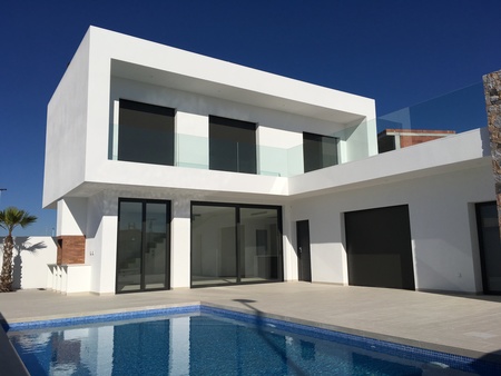 Brand new luxury villas in Santiago de la Ribera, Murcia (Costa Calida). The property boasts a spacious living/dining area, fully fitted kitchen (Bosch appliances), three bedrooms with fitted wardrobes and electric shutters, two fully fitted bathrooms with under floor heating, private swimming pool with blue ceramic tiles and white led lighting, air conditioning throughout the property, storage room and off road parking. Santiago de la Ribera is on the Mar Menor, on the coast of Murcia. This old fishing village has 4 kilometres of beach, with fine, golden sand. Its Mediterranean waters are ideal for enjoying the sun, sea and water sports all year round. It has an attractive, palm-lined promenade that runs the length of the beach.