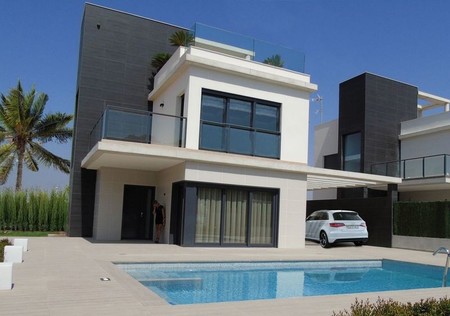 Brand new 4 bedroom, 4 bathroom, detached villas in Playa Honda, La Manga. Playa Honda is an idyllic spot bathed by the waters of the Mar Menor. The area is noted for it's beaches, golf courses (the famous La Manga Club is close by), fine dining, water sports, archaeological sites and traditional festivals. Villas Playa Honda are located next to one of the calmest, safest beaches in the area. The outside area is a minimum 444 m² and has an 8 x 4 m private swimming pool and private off-road parking. The living area is distributed over 2 floors, with a large lounge/diner, an open plan kitchen, a double bedroom with en suite shower room and a separate toilet downstairs. Upstairs are 3 double bedrooms, 2 shower rooms, a 18 m ² sun terrace and an internal staircase takes you up to a large private 45 m² roof solarium where you get the sun all day..