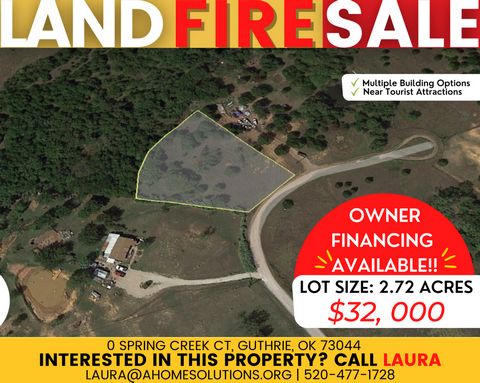 NO ZONING! 2.72 Vacant Land in Spring Creek Estates, OK! Don’t Miss Out on this Amazing Deal! ********************** ~~ Contact Laura to learn more: 520 477-1728 – laura@ahomesolutions.org ~~ ********************** WHY BUY THIS PROPERTY? 1. You’re a phone call away from beginning a new chapter of your life in this exciting city! Our alternative Payment Options are here to aid with your transition as well. Contact Laura for details & to make an offer. 2. For Sale values in this area are heating up! But YOU can get this BARGAIN at a Steal! 3. Multiple Purchase Options Available! Purchasing this land is easy, with our $10,000 down & $491 monthly payments or $32,000 cash! ********************** Community Details: You found a “needle in a haystack”! This STEAL won’t be around for long! Perfect for Building your Forever Home with the joys of living in peace and tranquility! Whether you’re looking for a Relaxing weekend or an Adventure-packed GetAway, the City of Guthrie has got you covered! Contact us now to learn about our flexible payment options. ********************** PROPERTY USE: Property is UNZONED and classified as Residential. Reach out to Logan County’s Clerk to know Spring Creek Estates covenants. – Allows Detached single-family dwelling **************************** PROPERTY INFORMATION: – Lot Type – Vacant Land – Sale Price – $32,000 – State – Oklahoma – County – Logan – Assessor’s Parcel Number – 420039584 – Property Usage – Allows Single Family Homes – Property Address – 0 Spring Creek Ct, Guthrie, OK 73044 – Size – Acre(s) – 2.72 – Road Access – Paved road – Electricity – at the street – Water – private/well – Septic – private/septic system **************************** HOW TO ACCESS: – Lot GPS Coordinates: 35.909170, -97.339402 – 6901 Spring Creek Ct is the address to the neighbor’s house. Use these coordinates: 35.908496, -97.339026 – You may use Google Map to see options on getting to the property **************************** POPULAR ATTRACTIONS: – Oklahoma City National Memorial & Museum, 36 minutes away – A beautiful & heartfelt way to honor those who lost their lives and responded during a horrific tragedy – Scissortail Park, 37 minutes away – Lots to do here! Playgrounds for children, water sprinklers to play in, a small rock wall, gardens, and sometimes there are even food trucks nearby. **************************** PURCHASE OPTIONS: Get this deal today for $32,000 cash! Or finance $32,000 with $10,000 down and monthly payments of $491. **************************** GOT QUESTIONS? WE HAVE ANSWERS! – Call/Email Laura @ 520-477-1728, laura@ahomesolutions.org. – We may have other properties at bargain prices available. All you have to do is ask! – Don’t hesitate! Connect with us today while this incredible deal is still Available! **************************** DISCLAIMER: Buyer must verify & work with County to know what can & can’t be done with the land, obtain proper permits if needed & confirm the availability of any utilities needed/serviced on the lots. Seller makes no warranties or representations about the land, its condition, or what can be built on the parcel.