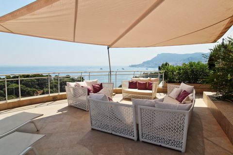 In the heart of Cap Martin, in a luxury residence with swimming pool, caretaker, park and tennis court, magnificent penthouse top floor with roof terrace and panoramic sea view and Monaco!
