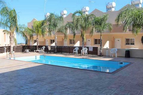 Set on a well maintained complex with communal swimming pool this bright town house has a private entrance from the street and stunning views across the countryside to the ghost town of Famagusta and the sea. Downstairs is an open plan living dining and kitchen area with guest wc and back door which leads into the complex and the swimming pool. Upstairs are 2 good sized bedrooms each with fitted wardrobes and a family bathroom. The master bedroom at the front has a small balcony with those amazing views.
