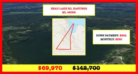 5.54 Acre in Hastings, MI – 110 ft LAKEFRONT at Head Lake – Great for Fishing and Boating – Similar Properties sold at $93,000 and More! BUY FOR ONLY $69,970 Note: We sell real estate at discount wholesale prices! Call this beautiful property your own now! This lot has its own lakes access with 110 ft lakefront! This allows you to build your own jetty as well as the opportunity to fish from your own property! Perfect for a vacation home or a nice place for your retirement! Also perfect for young families. School, restaurants and other shopping facilities are only 15 minutes away! In ONLY 2 hours you are in Detroit. Within 60 minutes you reach Lansing. In 50 minutes you are in Grand Rapids and in 40 minutes in Kalamazoo! Buy this property today for just $69,970Interested? Call or txt Living Enterprise Inc. @ 239-241-8569Property Type: LandSale Price: $69,970State: MICounty: BarryAPN (Assessor’s Parcel Number): 07-008-008-20Property Address: 42.566563, -85.388343City: HastingsZip: 49058Size: 5.54 Acre(s)Short Legal: HOPE TWP SEC 8-2-9 COM N89DEG 08’51” W 249.84 FT FRM SE COR OF SEC FOR POB TH N89DEG 08’51” W 551.98 ALG SD LN TH N33DEG 54’23” E 835.74 FT TO INT TRVS LN SHRHEAD LK TH S50DEG 25′ 24″ E 136.73 FT ALG SD LN TH S15DEG 24′ 59″ W 156.66 FT TH S02DEG 42’48” E 464.2 2 FT TO POB SBJT TO ROW OVR S 33 FT HEAD LK RD SPLT FRM008-008-00 2003Zoning: RLRoad Access: Yes – UnpavedElectricity: Within 1/4 of a mile Market Value: Similar lots in the area are selling for $142,700. Get this property now for $72,730 below market value…Own it today for just $69,970Don’t have the cash? We also offer owner financing — no credit checks required!To buy this property at this discount price call or txt Living Enterprise Inc. @ 239-241-8569Don’t miss out on this great deal call or txt us now! Note: We also may have other property at bargain prices just like this available – ask us when you call!