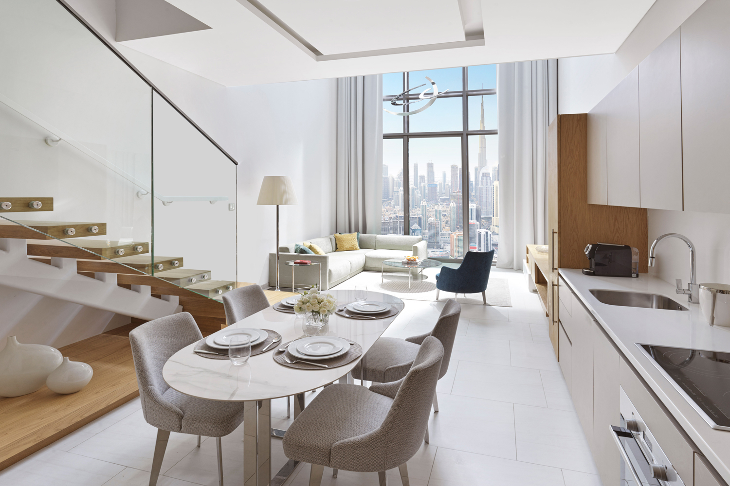 Located in the downtown district, the property offers spectacular, unobstructed views of the world’s tallest building Burj Khalifa, as well as Dubai Creek. Two magnificent infinity pools are situated atop the 75-storey tower offering an incomparable 360-degree aspect of Dubai, making the pools among the highest not just in the city, but globally.