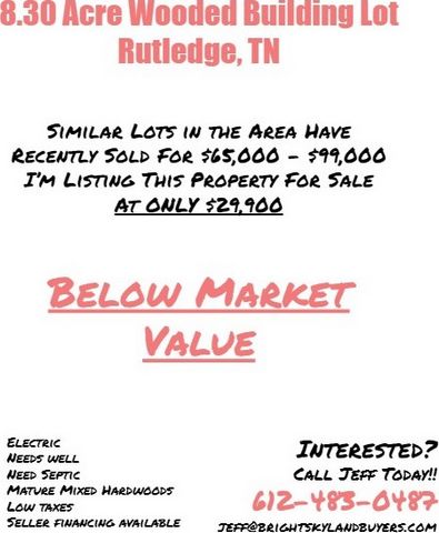 Great Opportunity to own 8.30 Acres of Unrestricted land Priced $8,600 Below Market Value Build a home or use for recreation. Lot has beautiful views of the adjacent rolling hills and mountains. Open to many different types of homes – Stick built, Modular, Cabin, Log homes. Mobile Home, RV etc. Perfect for Camping, Hunting etc. Electricity is available. Need septic and well if you want to build. Popular Rutledge Activities – Water Sports, Hiking, Fishing, Camping, Motor Sports. Utilities Electric is available. Need Well and Septic if planning on building Distance from Cities and Attractions: Knoxville – 48 minutes Kingsport – 1 hour Maynardville – 42 minutes Smokey Mountains – 1.5 hours Chuck Swan State Forest – 1 hour Cherokee Reservoir 14 minutes Straight Creek Boat dock – 49 minutes GPS coordinates to the lot – 36.313350731515, -83.477718096852 $29,900 – buyer to pay closing costs. Financing is Available Disclaimer – Buyer must perform their own due diligence they should do with any land purchase. This land is sold as is and all information provided is to the best of seller’s knowledge. Seller does not guarantee accuracy of property location on maps or descriptions show in listing as well as facts describing the property. Buyer to verify all details of property including property location and boundaries and lot lines, as well as feasibility to use property for buyer’s desired purpose. Many of the pictures provided are not personally taken by the seller and some of the presented pictures represent the general area near/around the property. All utilities related to this property are potentially subject to a connection charge or additional expense to bring them to or onto the property. Furthermore, It is understood and agreed to by the parties involved that selling party, while holding an equitable interest in and to the property, is not presently making, and has not made, any representation to any party that it holds legal title in and to the property. To the fullest extent permitted by law, the Buyer hereby agrees to waive, release and forever discharge Bright Sky Land Buyers, BrightSkylandSales.com and all its affiliate companies from any claim, be it at law or in equity, that the Buyer, their heirs, transferees, assigns, subrogees, devisees, and agents may allege, arising out of our disclosure(s) of its present interest in and to the property, if any as well as out of any potential and accidental discrepancies in lot lines, pictures or property location to the actual property.