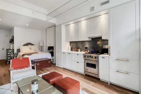 This efficient loft studio features southern exposures, oversized, custom 7-foot windows, high ceilings, private laundry, 7-inch wide white oak plank floors and custom, patina brass fixtures by Waterworks throughout. Extra sheving is made thanks to a beautiful custom made shelving.
