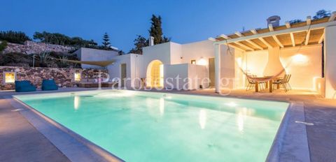 This magnificent villa of 317m², close to Naoussa, is located in a beautifully shaped estate of 4547m² with vineyard, olive trees and cypress trees that gives a green touch in the Cycladic landscape.