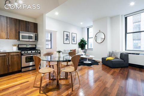 Residence 509 located at 1 Wall Street Court is a spacious and bright corner unit offering 2 bedrooms and 2 full bathrooms. An exceptional value at only $947 per square foot! When you walk in, you are welcomed by a large foyer which leads you into the beautiful living room accompanied by high ceilings. The open-concept kitchen features high-end stainless steel appliances. There are hardwood floors throughout the home. The master bedroom has a full en-suite bathroom with both bedrooms comfortably accommodating a queen-size bed. You will find a washer and dryer in the unit as well. The Cocoa Exchange at 1 Wall Street Court is an elegant boutique condo building. The beautiful rosewood lobby is attended 24 hours a day. Residents have full access to the penthouse lounge and outdoor rooftop terrace with cable television, WiFi, and a wet bar. The building is also surrounded by countless dining options, steps from the stone street, a short walk to both the South Street Seaport and Brookfield Place, Pier 17, Westfield Mall and is close to all major transit lines [1,2,3,4,5,A,C,J,Z,R].