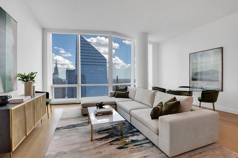 Panorama Residence 76F is a two-bedroom residence of 1679 square feet with ceilings up to 10’10” and spectacular views of the Manhattan skyline. The great room features an open kitchen with a unique free-standing marble island, custom oak wood cabinetry, and Miele appliances. The master bedroom suite features two large walk-in closets and a luxurious master bath. A second bedroom with a walk-in closet and en-suite bath, a gracious entry foyer, a utility room with side-by-side washer dryer, and a powder room for guests make this a truly exceptional home.