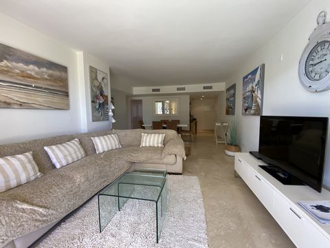 Beautiful apartment with all new modern furnishings, terrace with seating for 6 overlooking the gardens and to the sea and beach. Lounge with large patio doors to terrace, flat screen TV with English TV, dining table for 6 people, air conditioning. Fully equipped modern kitchen with large fridge/freezer, dishwasher, washing machine, tumble dryer, microwave. Master double bedroom with ensuite marble bathroom and air conditioning. 2 twin bedrooms sharing a large modern shower room, air conditioning. Garage for underground parking. Heating and air conditioning throughout. 2 minutes walk to beach, tennis club, sailing, shops. 5 minutes drive to La Marina and restaurants. Beach club closeby with you can pay to use daily.