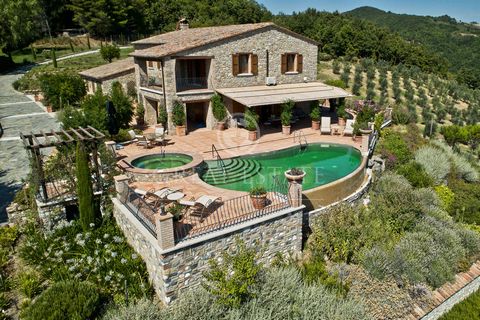 “Vista a Mandorla” is a prestigious farmhouse with olive trees, vineyards, almond trees and woods. It boasts an amazing infinity swimming pool, whirlpool with cotto solarium and breath taking view of the surrounding hills. The farmhouse, rebuilt in 2010 with its original materials and antiseisimc criteria, covers an area of 400sqm on two levels. At ground floor we have a large fully equipped kitchen, dining room, TV room with cinema seats and 75-inch TV, bathroom, laundry, pantry, double-height living room with hand-made marble fireplace with copper cane, study with fireplace, master bedroom with changing room and gym with treadmill and electric bike, en suite bathroom with steam shower, Turkish bath, whirlpool with colour therapy and radio. The pavement in the bedrooms is made in olive tree wood, while the other rooms have hand-made cotto floor. From the living room, through a hand-made chestnut wood spiral staircase, we get to the mezzanine floor, where we have library and balcony. A corridor leads to three bedrooms, one of which with terraced loggia; large marble bathroom with shower, bench and bath (possibility to build further bathrooms). All the rooms are provided with air conditioning and underfloor heating system. The property boasts large cotto terraces, pergolas and a portico with a Carrara marble fountain, surrounded by lavender, rosemary, pomegranates and roses. The house is in a high position, surrounded by beautiful gardens, partly flat and partly terraced, enriched by large stones. The property includes a cypress-lined boulevard, 2 electric gates with marble columns and 13ha of land with olive trees, meadows and woods. Possibility to purchase further 27ha of land with olive trees, 500 almond trees and vineyard (white varieties: chardonnay, grechetto, trebbiano and Moscato – red varieties: merlot and syrah – labelled wine) with cellar. Splendid panoramic view.