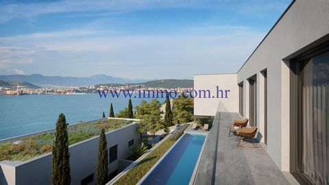 Six luxury villas under construction for sale, situated in an attractive location on the northern side of the island of Čiovo, approx. 15 km from airport and close to all amenities. The construction began in 2019 and the end of the work is planned for June 2020. All villas are built to meet the highest standards with materials and equipment of highest quality. Villa 6 of 330 sq.m. stands on the plot of 662 sq.m., 100 m from the sea and spreads over two floors offering fantastic sea view. The ground floor consists of spacious living room, kitchen, work room, additional room, boiler room, toilet, gym with sauna and a garage. The living room has direct access onto the patio with private swimming pool. On the upper floor there are two bedrooms with en suite bathrooms, one bedroom with wardrobe, additional bedroom and one separate bathroom.