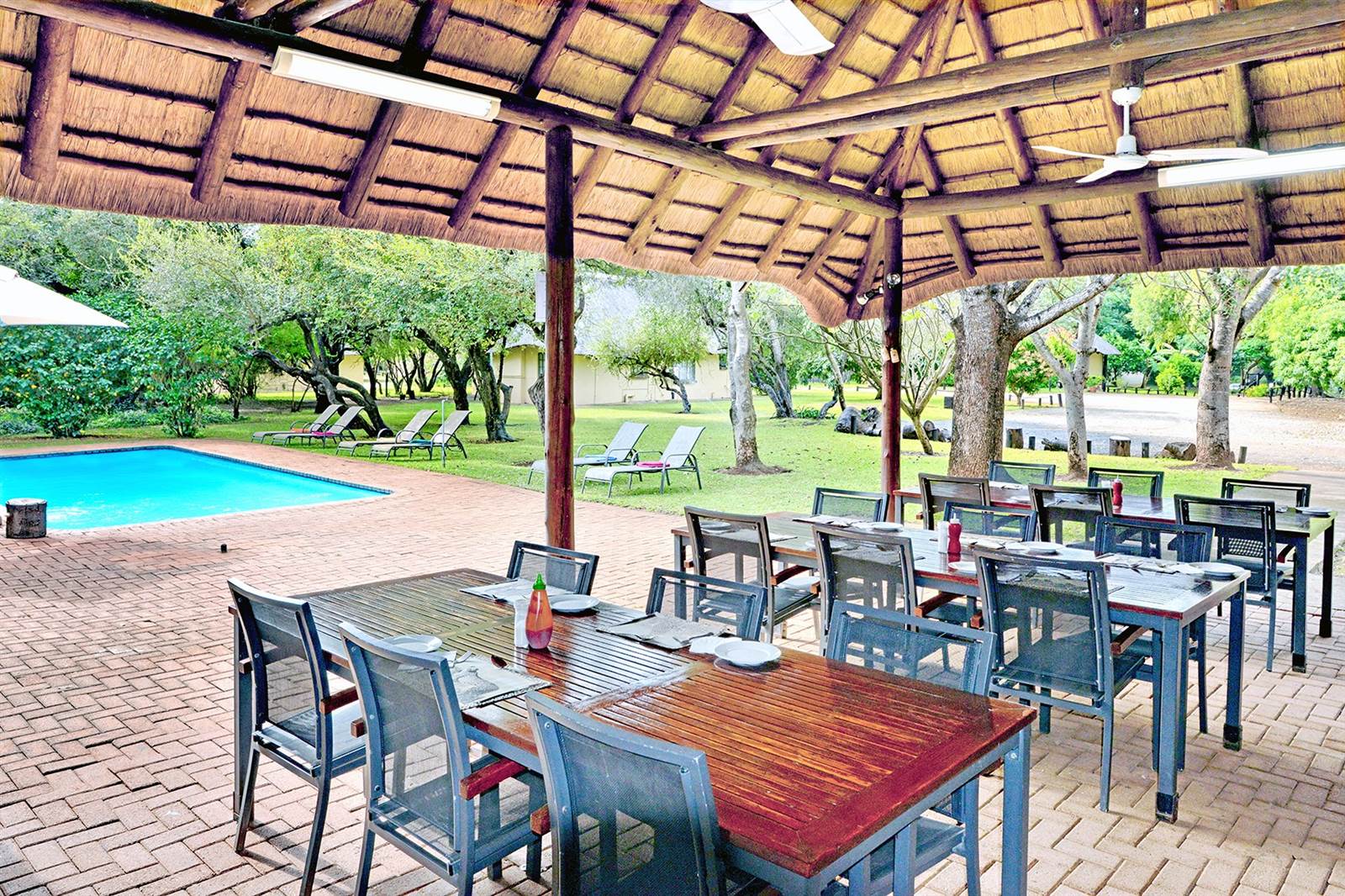 The 14 chalets are laid out in either with twin, double or triple bed configurations. The rooms are spacious are tastefully decorated, and a home away from home atmosphere pervades. Each room comes standard with air conditioning, flat screen television with DSTV bouquet, built in cupboards, digital safe and en-suite bathroom. A kitchenette with full self-catering ability, including appliances and utensils is also a standard feature in every room. All rooms have their own private patio and braai facilities leading out from the bedroom.