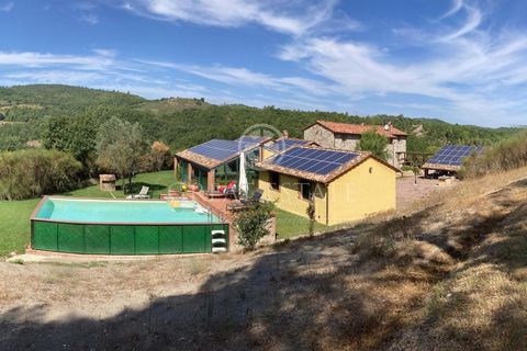 The main farmhouse has a total usable living space of approximately 259 square meters and consists of two levels. On the first level you will find a large eat-in kitchen with fireplace, a dining room with a view overlooking the valley, a bedroom, bathroom and laundry area. On the second level, which can be accessed from both an internal and external staircase, you will find a large living room with fireplace, two bedrooms, two bathrooms and a panoramic terrace of approximately 18 square meters, connected to the main farmhouse via a porch of about 20 square meters. The first annex is approximately 98 square meters, composed of a living room with kitchenette and fireplace, two bedrooms and two bathrooms. Just a few steps from the main farmhouse there is a second annex of approximately 52 square meters, composed of a living room, kitchen, two bedrooms and two bathrooms. Adjacent to the second annex is a greenhouse of about 81 square meters. The property includes a swimming pool measuring 13×26 feet, and 55 acres of land, of which about 1.65 acres make up the park/garden and about 53.35 acres make up the woodland and arable land.)