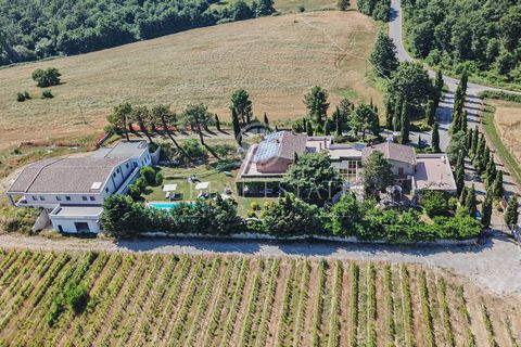 The main villa of 500 square meters, restoration of an old stone farmhouse, is made up of two levels. Entering from the elegant entrance on the ground floor, you will find a large living room of about 150 sqm with fireplace, which leads to the winter garden with oven and barbecue. Crossing the living room you reach the panoramic terrace. Also on the ground floor you will find the 25 sqm studio, guest bathroom, kitchen of 50 sqm with bathroom/laundry and pantry, as well as a 25 sqm room with bathroom. On the second floor there are three double bedrooms and a sitting room, all with exit to the terrace and 3 en-suite bathrooms. The annex of 150 sqm adjoining and also accessible internally, is composed of a double living room, kitchen, three bathrooms and three bedrooms with access to the panoramic terrace, always with excellent finishes. The property is completed by the garages with internal access to the main building, the basement and the technical rooms. The cellar of about 800 sqm is on two levels and was recently built, but needs to be completed. In the basement you will find the bottling area, the air-conditioned barrel room, and the administration office with 4 bathrooms, a panoramic terrace for outdoor tastings, a compartment for 22 wine barrels and a grape processing area. The entire property is surrounded by 3,000 sqm of land, where there is a beautiful swimming pool with whirlpool of 100 sqm, heated by the heat pump. The property extends for 18 hectares, 15 in the estate completely fenced in and complete with various access gates, of which 11 of DOC vineyards and 4 of woods where there is also a natural lake. The vineyard, planted between 2000 and 2002, is a spurred cordon, registered in the Orvieto red DOC (Sangiovese, Merlot, Cabernet Sauvignon and Montepulciano). A short distance from the property there is an organic and DOP olive grove (Leccino, Moraiolo and Frantoio varieties) of about 4 hectares that allows the production of extra-virgin oil.