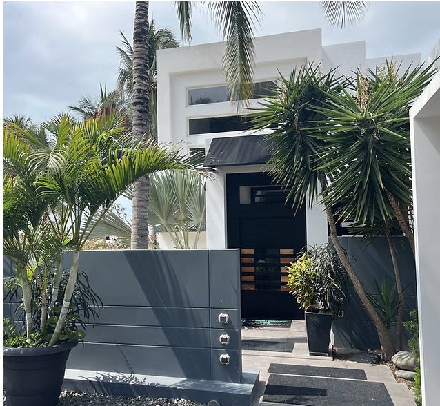The property sits on a beautifully fully landscaped lot of 1,082.51 m2 with a substantial 298.95 m2 of constructed space. The architecture and interiors are a testament to an Eclectic design style, artfully blending modern lines with serene, natural touches. A striking feature upon entering the property is a magnificent carved stone representing a shaman from the ancient Jama Coaque Culture, a piece of art created by local artist Ricardo Alcivar, setting a sophisticated cultural tone.