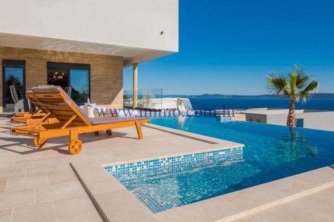 Luxury villa for sale located on the south side of the island of Ciovo. The villa is located on a hill, 200 m as the crow flies from the sea and has a fantastic, breathtaking view of the sea, islands and surroundings. The villa was built in 2018 using the highest quality materials and equipment. On the ground floor there is a garage for two cars with direct entrance to the villa, gym with jacuzzi, sauna, bathroom, storage and laundry. The main entrance is on the first floor, which consists of a spacious open-plan living room with kitchen and dining area, a bedroom with bathroom and a small storage room. The living room leads directly to a spacious terrace with pool (30 m2) with sun deck and a large stone fireplace. The terrace offers stunning sea and sunset views. On the upper floor there is a master bedroom with bathroom and access to a terrace of about 15 m2 overlooking the sea and two more bedrooms with bathrooms. All floors of the villa are connected by an internal staircase. The villa is very stylishly decorated and equipped and surrounded by a landscaped garden. Infrastructure: paved driveway, electricity, water, septic tank.