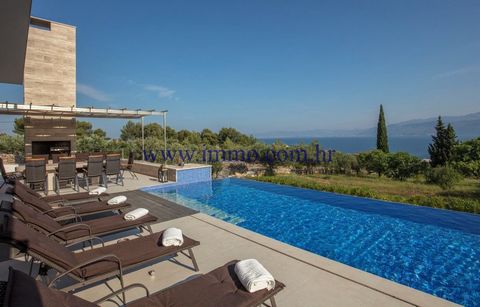 Luxury villa for sale located in a quiet location on a hill on the north side of the island of Brac. This magnificent villa has two floors, partially paved with Brac stone, and has a heated and counter-current pool (55 m2) and barbecue, also made of Brac stone. The ground floor of the villa consists of a spacious living room with kitchen and dining area, bathroom and storage. The two opposite sides of the ground floor have sliding glass walls that fill the space with lots of natural light and turn the whole space into a large open plan living room with direct access to the pool on one side and a terrace with an outdoor jacuzzi on the other. An internal staircase leads to the first floor with four bedrooms with bathrooms and balconies. The bedrooms have underfloor heating and inverter air conditioners. The villa is surrounded by a well-kept green area that provides comfort and privacy and is located in such a way that from all rooms has a stunning panoramic view of the sea, surroundings and sunset. There is also parking for six cars on the plot. Infrastructure: paved driveway, electricity, water, septic tank.