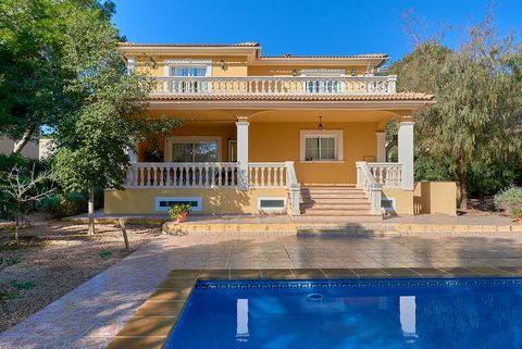 On the ground floor the living area is distributed in a large open plan entrance hall, a living/dining room with fireplace, a kitchen with cooking island as well as a lot of storage and work space and a guest room with separate bathroom. On the first floor there are 4 further bedrooms with large built-in wardrobes, one of them with dressing area, bathroom en suite and access to a balcony with views to the garden and the pool and another bathroom.