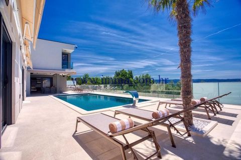Beautiful new villa for sale situated on the hill in Splits subrub – Podstrana. It was built in 2021, has two floors connected by inner stairs and gives fantastic panormaic view of sea and surroundings. Main entrance is situated at upper floor which consists of three bedrooms with its own bathrooms and seaview. From hallway and one of the bedroms is possible to get to terrace with jacuzzi and panoramic view. Lower floor has a living part and space for recreation. Living part consists of livingroom with open concept fireplace, kitchen with dining room, extra bathroom and bedroom with en suite bathroom. Recreational space provides summer kitchen, sauna, bathroom, billiard and audio visual equipment. Whole ground floor has glass walls with exit to spacious terrace with pool, sun deck and grill with dining room. Swimming pool of 37.8m2, equiped with water heating system, hydro massage and automatic system for salt electrolysis. Villa is nicely designed, luxury furnished and equiped. Behind villa are parking spots for 4 cars. Infrastructure: asphalted acces road, electricity, water, septic tank.