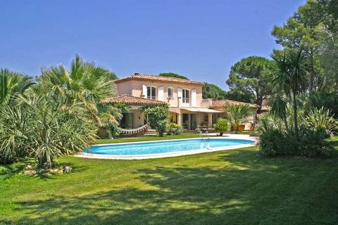 In a secured private little domain close from the beaches, this recent villa in the style of Provencal bastides on 2000m2 enclosed landscaped grounds with pool welcomes comfortably up to 8 guests in a contemporary refined decoration. The villa comprise on the main floor a large double living room with fireplace opening onto the exterior covered terraces with barbecue, exterior saloon and alfresco dining, and the pool, a fully equipped kitchen, the master bedroom with bath opeining onto the pool and one double bedrooms with shower. Two double bedroom, each with shower and opening onto a terrace are situated on the upper level. Air-conditioning in the bedrooms; Large exterior jacuzzi; Luxury services and personnel on demand; Rental June to September, min. 2 weeks;