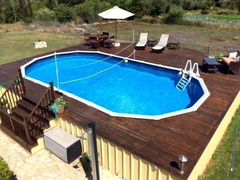 A private concrete drive of approx 500m takes us to the 100sqm villa which sits on a plot of 3.211sqm. The villa can be extended by another 100sqm. The garden is fenced and has electric gates. It is split into two sections, one being lawned and the other a paddock and chicken run.The villa consists of a new fully fitted kitchen, open plan lounge diner with open fire, 2 bedrooms, large bathroom and benefits from central heating, ceiling fans in each room, double glaze windows and mosquito nets. The house is fitted with CCTV and has its own drive and garage.