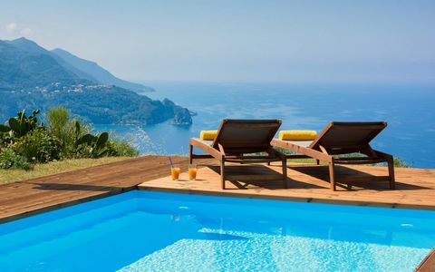 This private villa sits on a hill, in a plot of 2.400sq.m. It consists of two levels. The main entrance takes to a spacious open plan living/dining area with a fireplace, with unobstructed views to the sea. The ground floor also consists of a separated, modern, fitted kitchen, one bathroom, one bedroom and a storage area. A staircase takes us to the first floor which consists of the master bedroom which has ensuite bathroom and a walk-in closet and one more bedroom, again with an ensuite bathroom. Each bedroom has its own balcony.