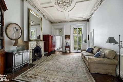The parlor floor, with 11’6” ceiling, boasts exceptionally preserved 19th Century ornate moldings, including a unique arch midway. There are 9 fireplaces, 6 of which have finely carved white marble mantles. All floors have high ceilings and original crown moldings. To complement this twenty-room home is an enormous backyard, surrounded by lush gardens, maximizing the southern light in a private oasis. The lot is 21 x 98, built 4 stories plus a standing height cellar, totaling over 5,000 square feet, with an almost 400 square foot roof deck. The front yard of this house is surrounded by a rare fleur de lis iron gated iron fence.