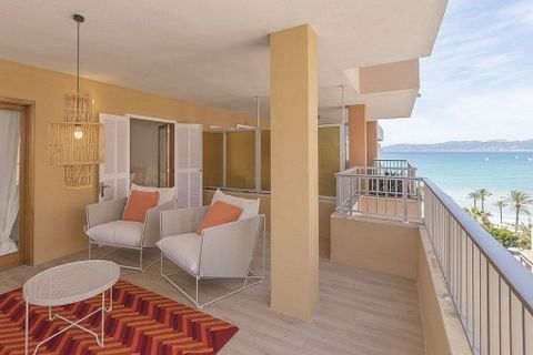 Its living space is distributed over 4 bedrooms, 2 bathrooms, a large living/dining area, a fitted kitchen, a room for washing machine and drier and a small terrace to the rear. The living area has access to an approx. 24 sqm terrace with beautiful views of the beach in one of the most popular resorts in Mallorca.